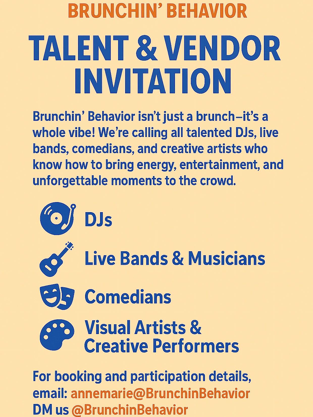 Brunchin’ Behavior isn’t just a brunch — it’s a whole vibe! We’re calling all talented DJs, live bands, comedians, and creative artists who know how to bring energy, entertainment, and unforgettable moments to the crowd.